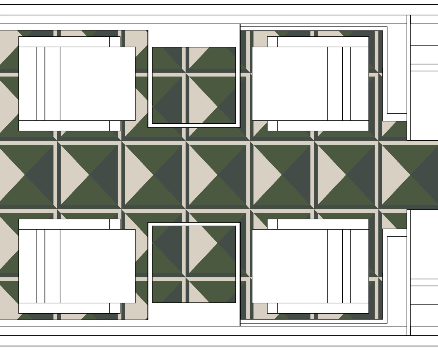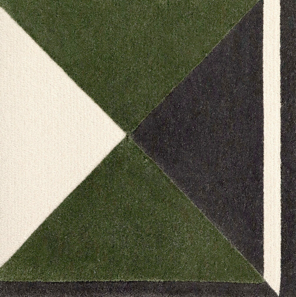 Intaglio, a geometric design from the Edward Fields archives depicts the carving of layers into darker rocks to reveal a stratum of lighter soil; this design is illuminated by rich green accents.