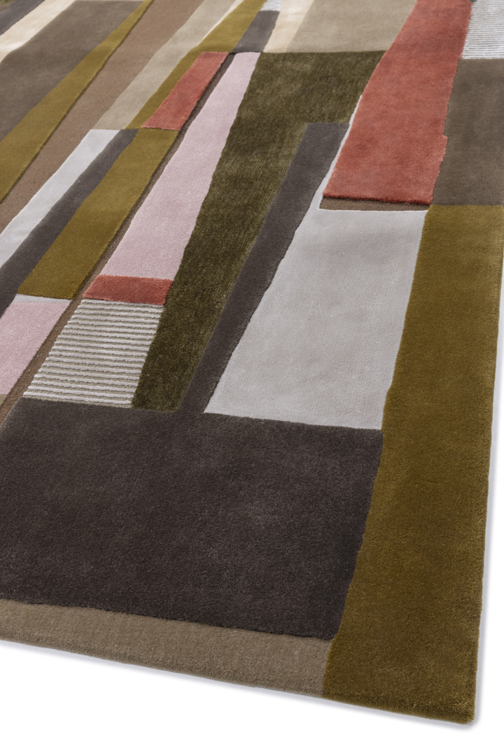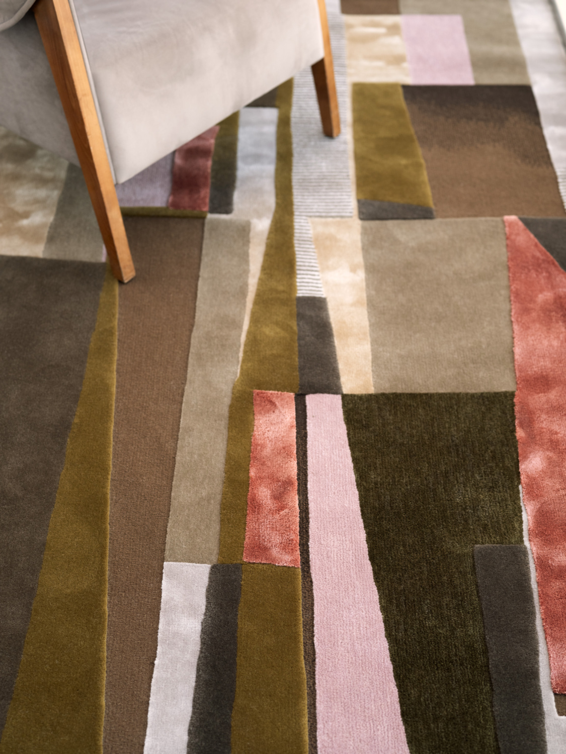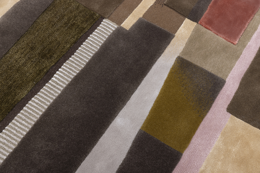 Dense and colorful oblong shapes huddle together like buildings stacked on a city block. A multi-level cut captures the rhythm of transformation. This silk-accented wool collage design pays tribute to the one constant in New York City: change.