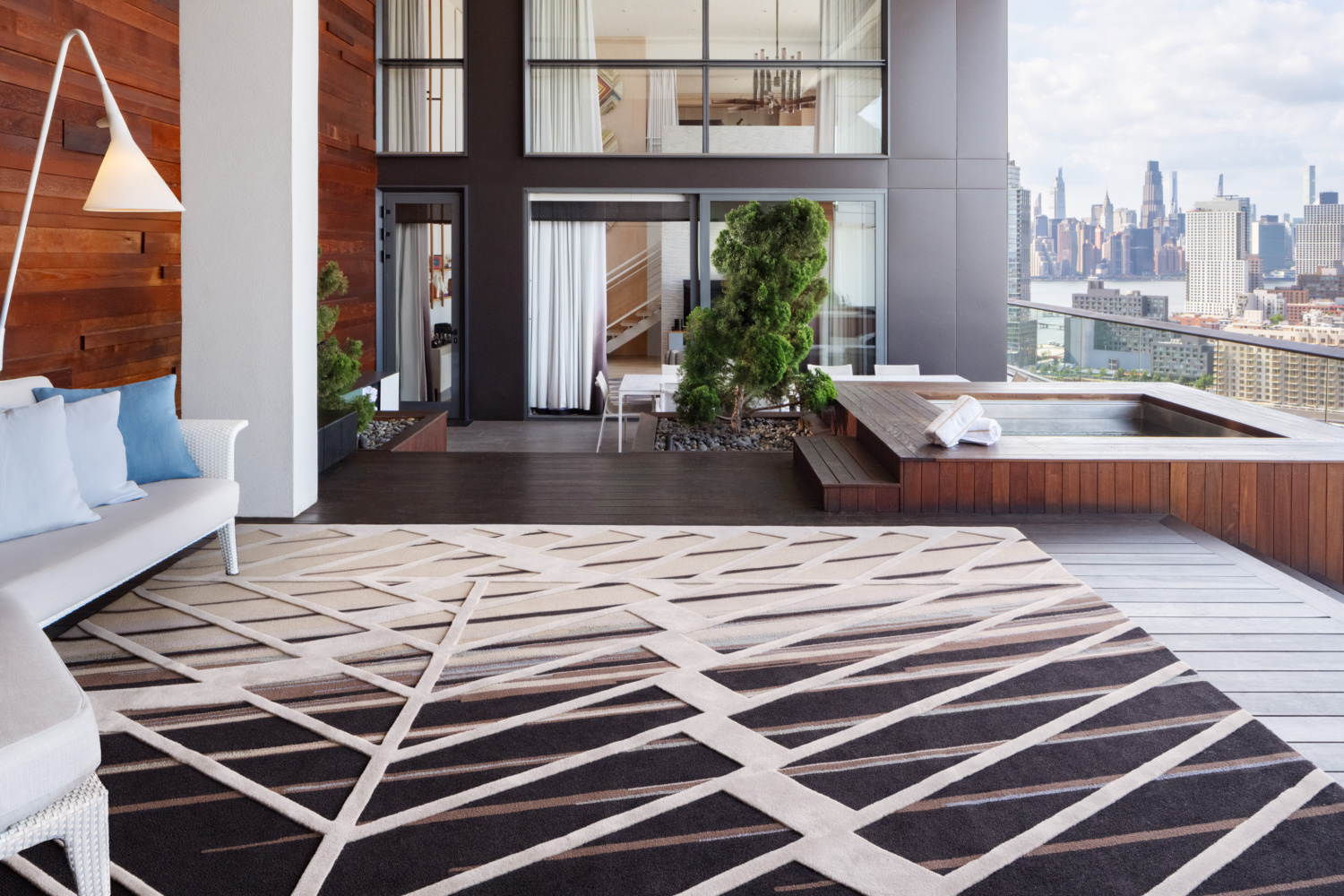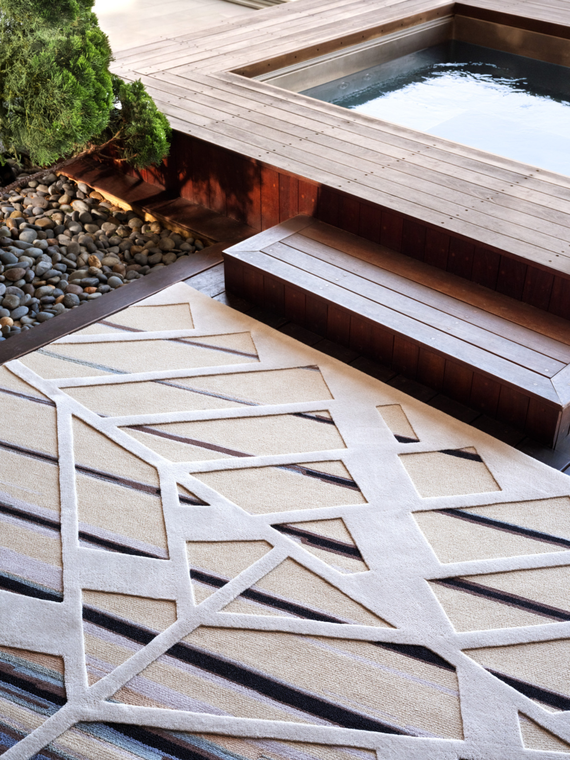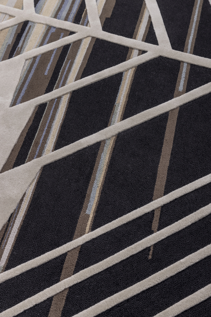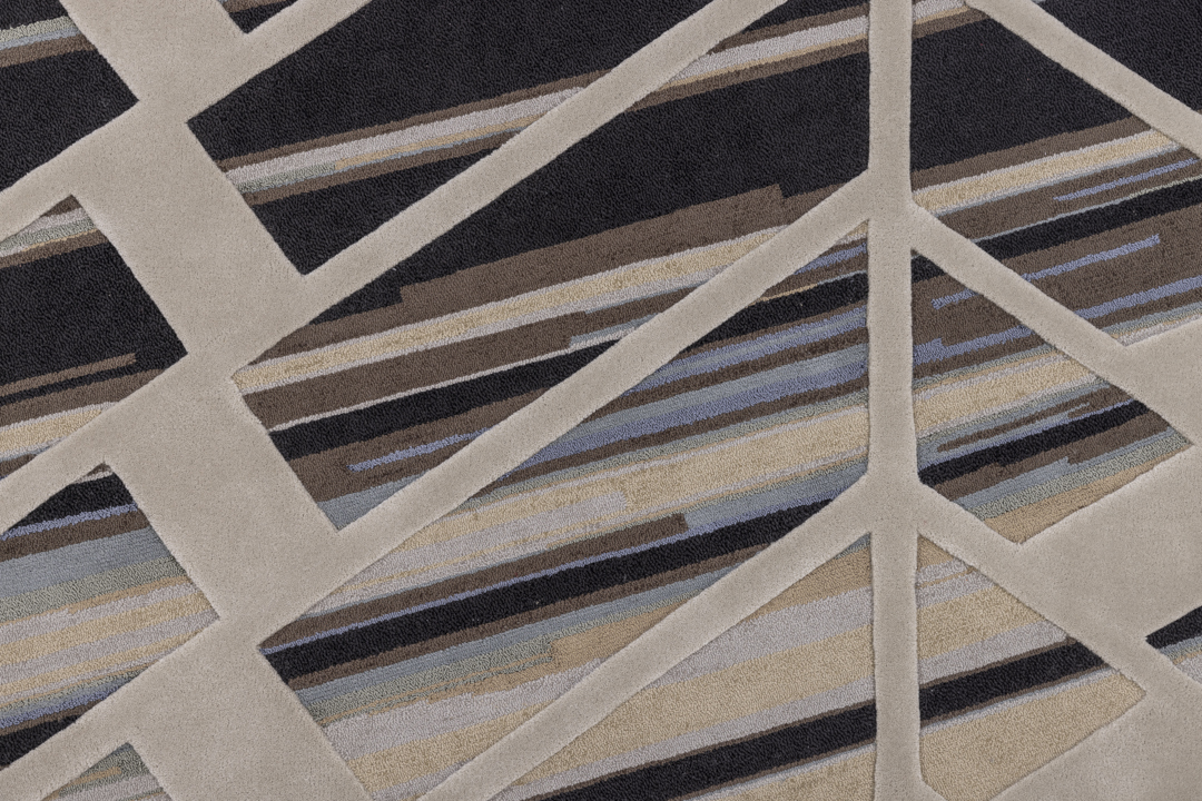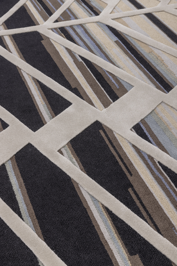 Inspired by an archival layout, this bold new composition imagines the cross-section where one building gives way to its neighbor, each frame a window into a vibrant, striated experience. Low loop pile articulation creates high contrast, imitating architectural tessellation.