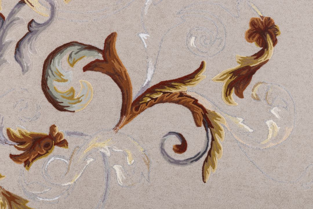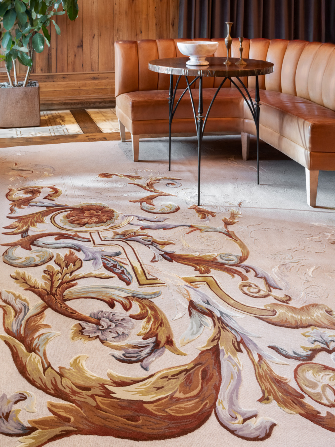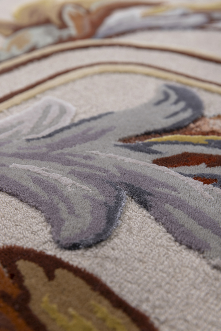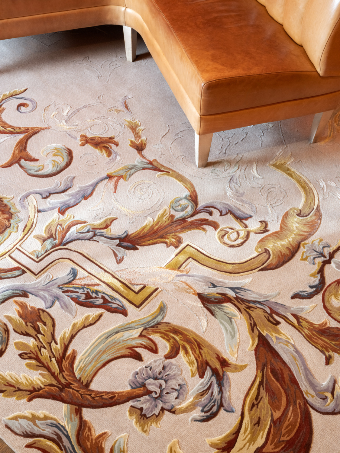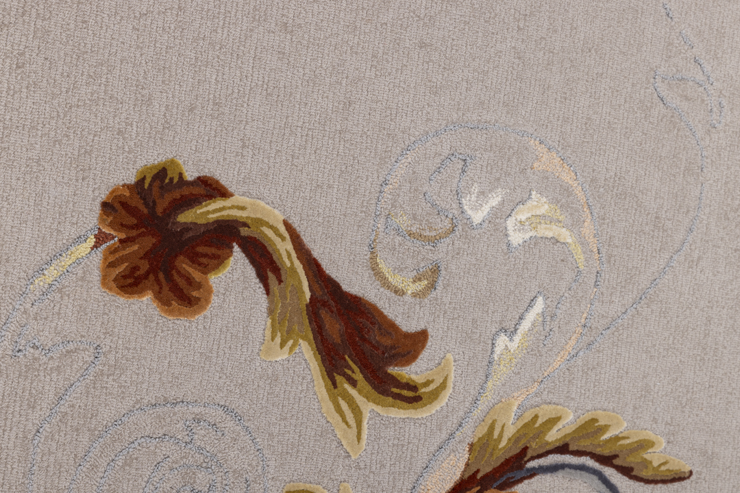 This textile’s refined motif evokes a grandeur of yore; it reinterprets a 1950s archival Beaux-Arts scroll in silk-accented raised cut wool against a loop pile ground. The resulting effect is part polished, traditional design, part sketch—a nod to the constant evolution of a draft in the making.