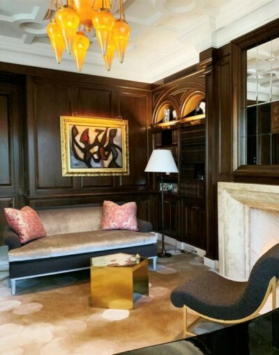 William McIntosh studio describes this design concept as: ” We love the English Baroque stylings of this Library but our very stylish client wanted it to be more sophisticated and artful. Our answer, a mix of classic Louis XVI style formal seating paired with a sculptural chair, lacquered desk and a modern hand tufted carpet. Your library should be a place that inspires and restores you mentally and spiritually. Creating an atmosphere that supports that was our goal for our client."